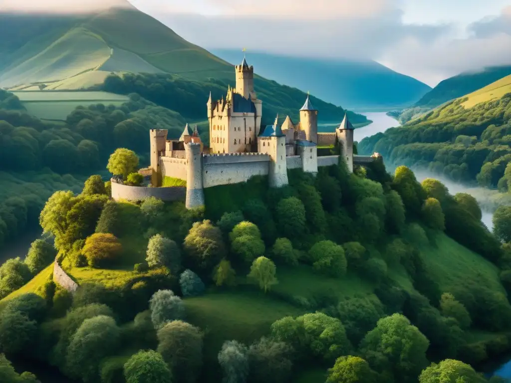 Un castillo medieval majestuoso rodeado de naturaleza exuberante, destacando la sostenibilidad en castillos medievales